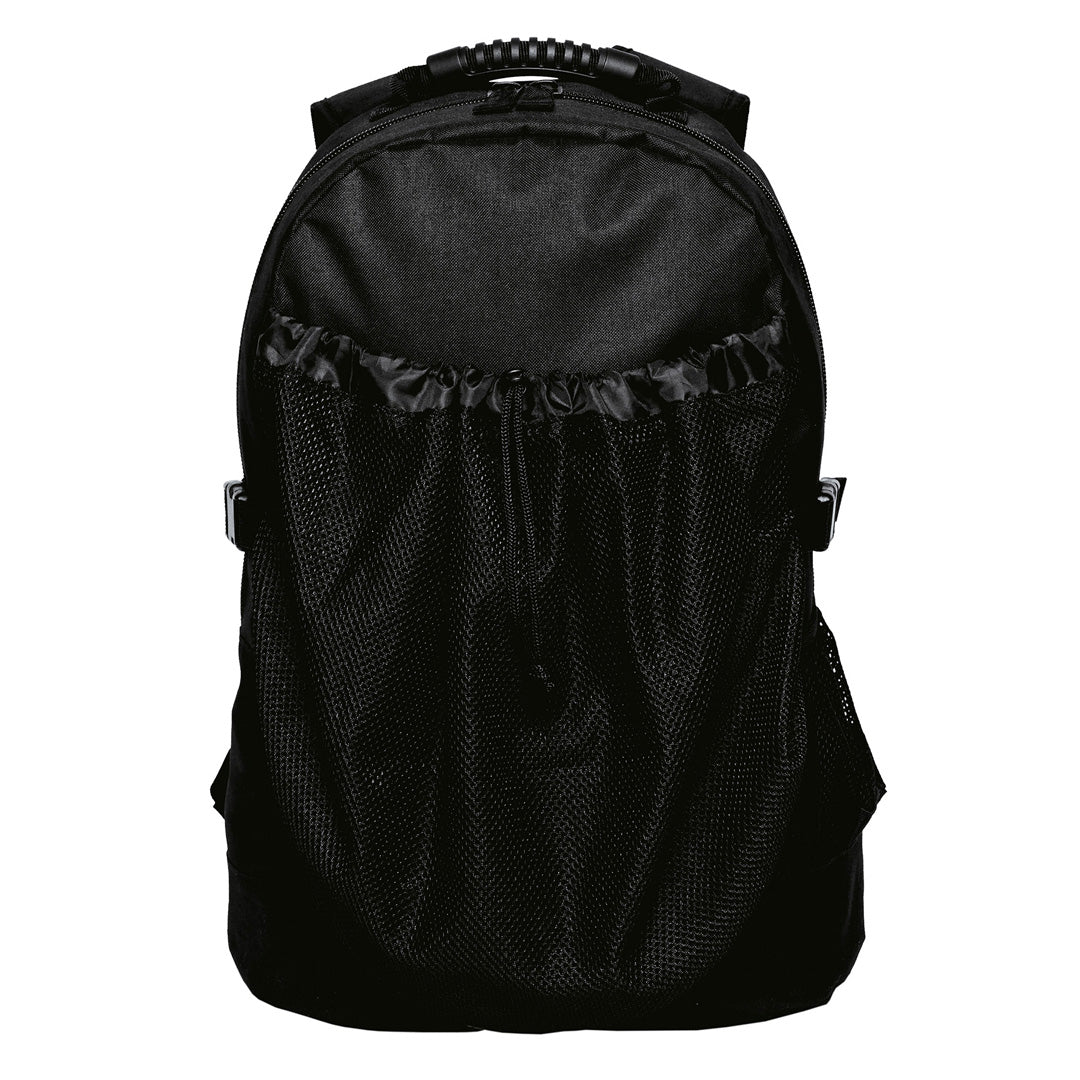 Featuring an external front mesh net compartment with adjustable drawstring the basket backpack is ideal for carrying balls, hardhats & helmets.