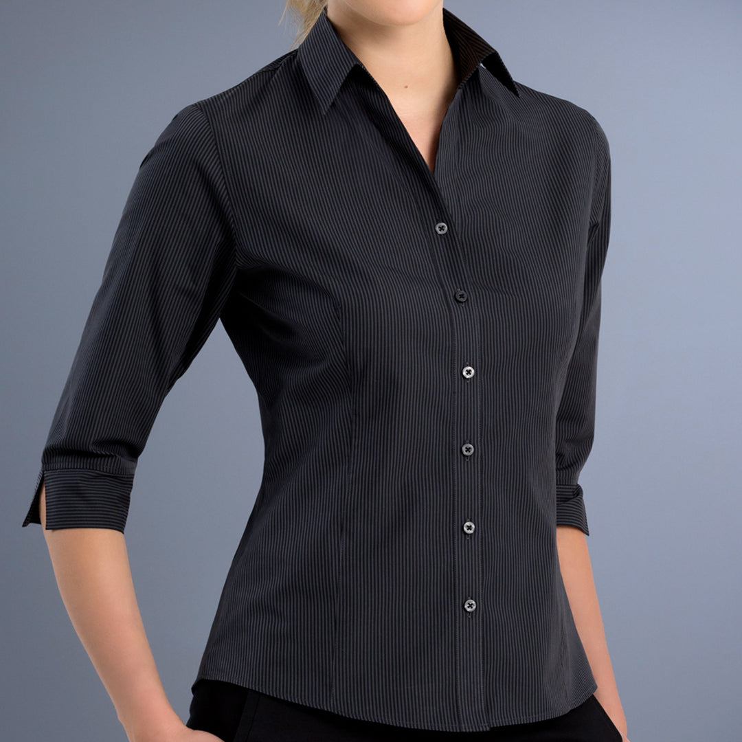 The Canberra shirt for ladies features a dark stripe pattern & open collar. An ideal choice for everyday business wear.