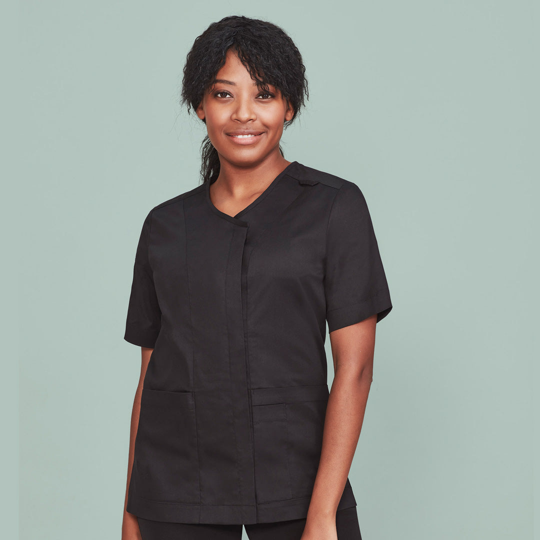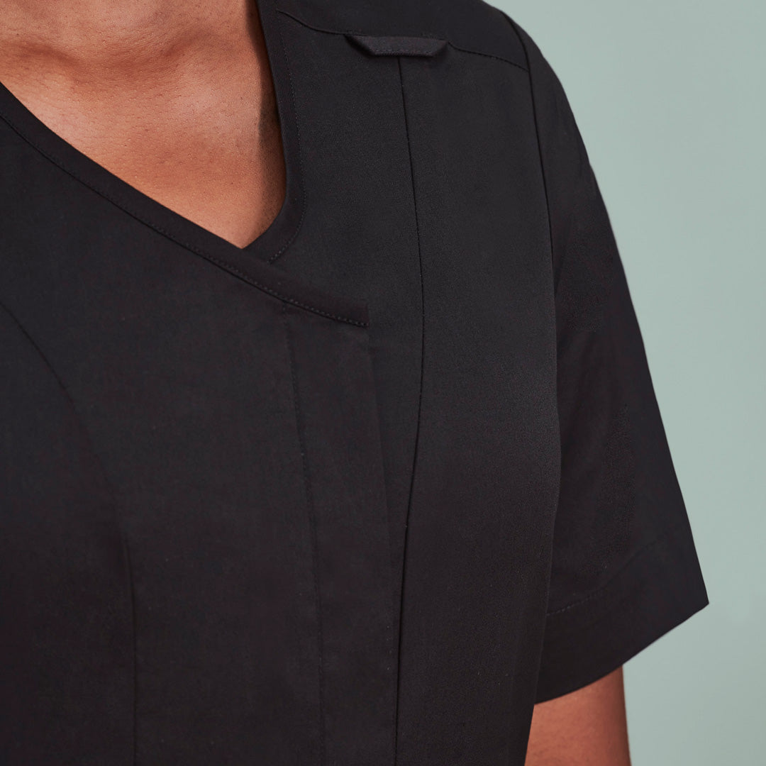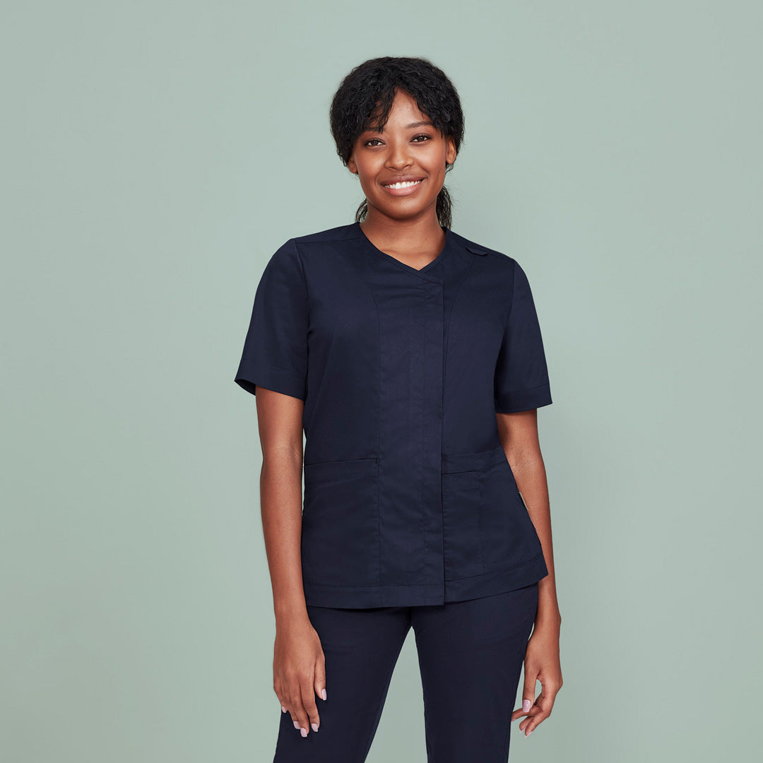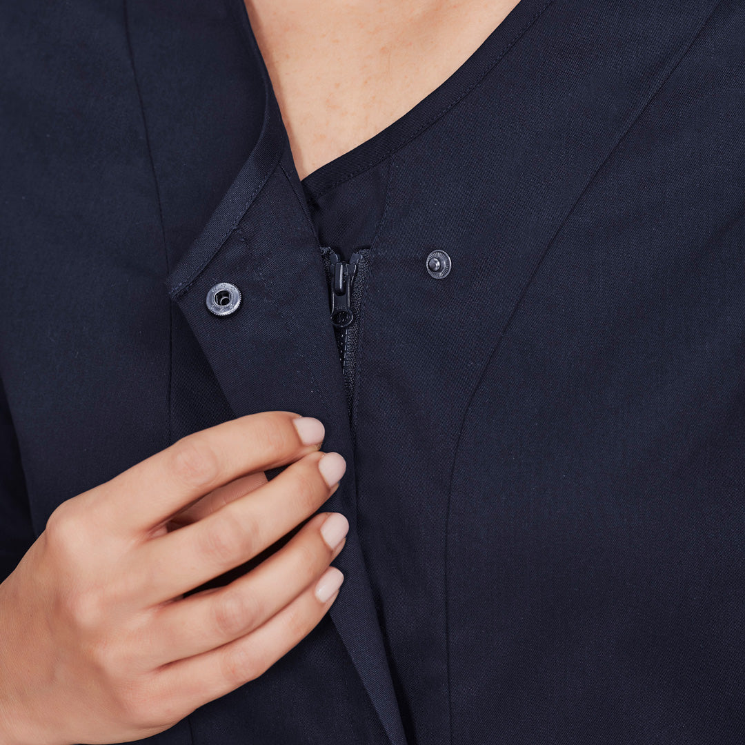 Featuring a stylish concealed zip front, the Parks scrub top for ladies is cotton rich offering comfort, style & durability.
